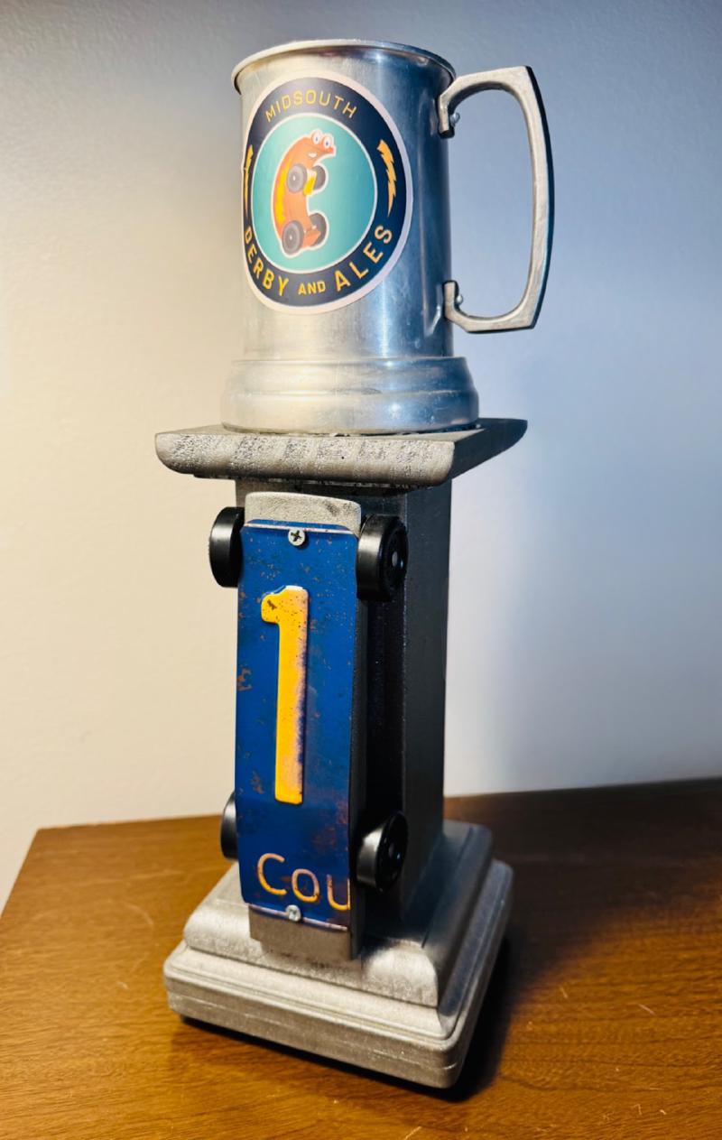 Mounted atop the pedestal sits a mangled pinewood derby car from the club’s inaugural 2019 season, nicknamed “Magic Man.” Legend has it the driver crashed so badly they swore never to build again, instead immortalizing their shame by holding up the trophy for all eternity.